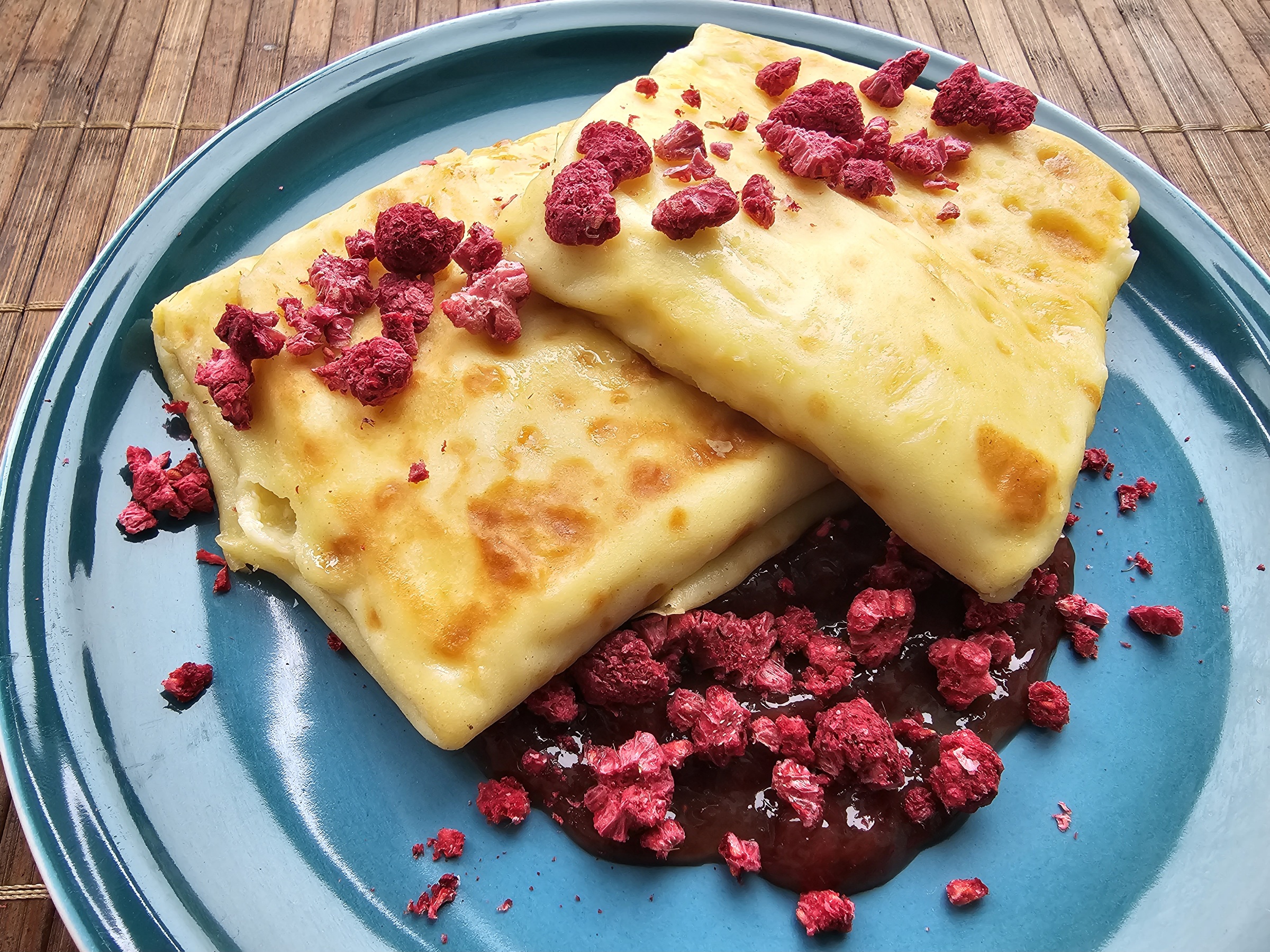 4. Serve the crepe envelopes with quark cheese filling warm. topped with fresh berries or a dollop of jam if desired.