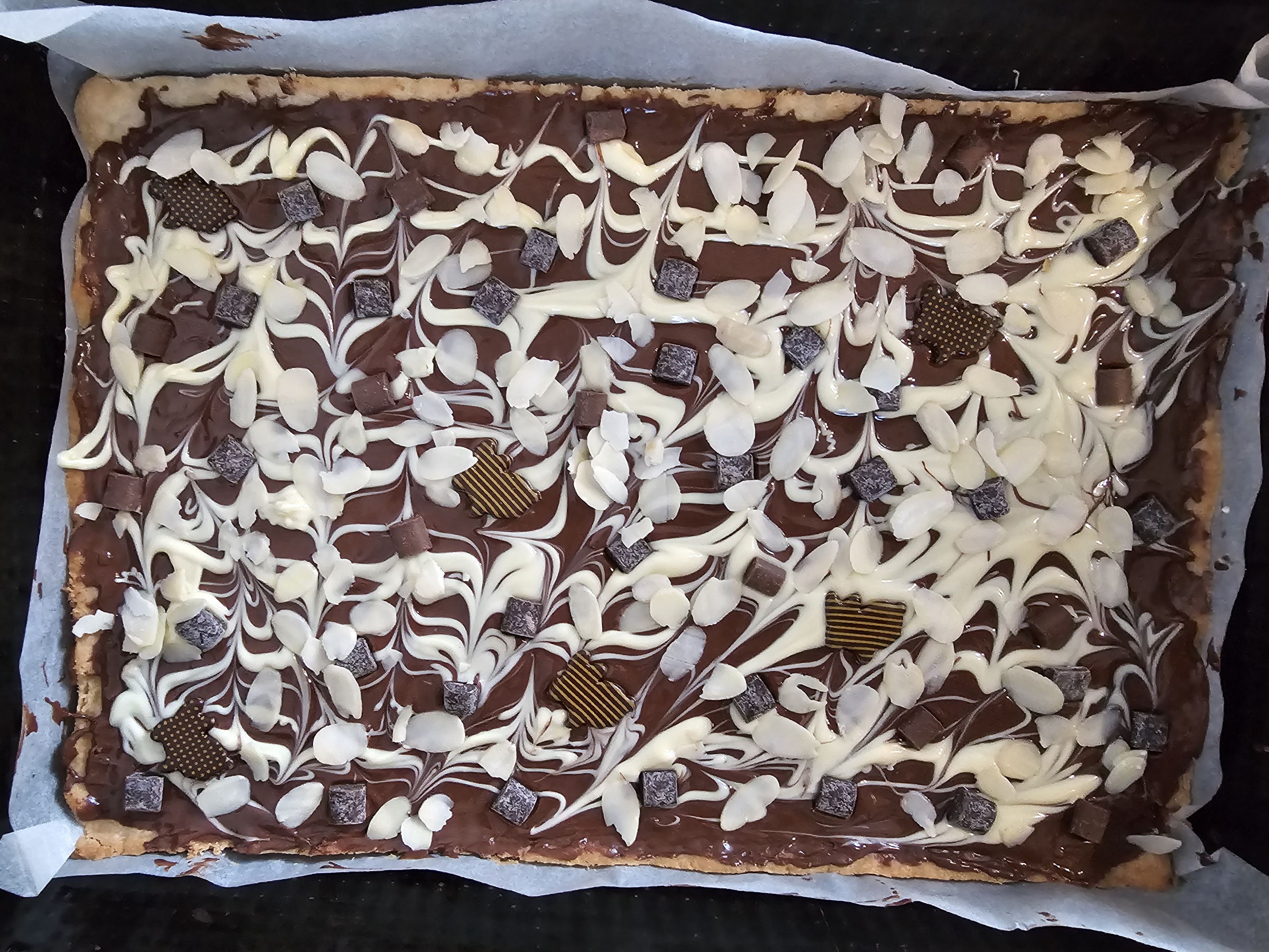Pour the melted milk chocolate over the shortbread and spread it evenly. Next, pour the melted white chocolate on top of the milk chocolate, in a zig zag pattern. You can use a toothpick to make a swirly pattern in the chocolates.